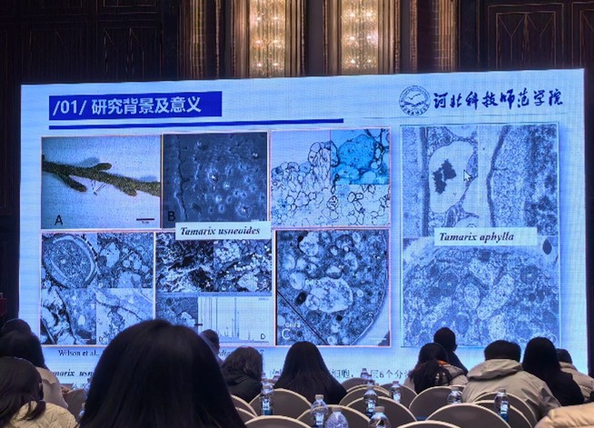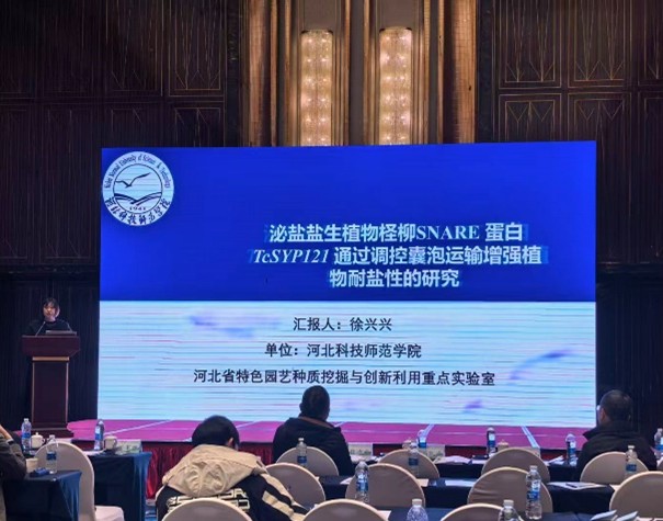 会议期间,团队成员徐兴兴在S5林木遗传育种分会场作了题为《泌盐盐生植物柽柳SNARE蛋白TcSYP121通过调控囊泡运输增强植物耐盐性的研究》的学术报告。报告深入解析了柽柳作为泌盐盐生植物的耐盐分子机制,揭示了关键蛋白在囊泡运输与抗逆生理中的调控网络。该研究成果引起了与会专家的广泛关注,现场就耐盐基因挖掘与林木分子育种技术进行了深入探讨,充分展示了团队在耐盐碱植物基础研究领域的最新进展。张国君经理带领团队重点与北京林业大学、西南林业大学、云南大学、河北农业大学等高校院所的专家进行了广泛而深入的交流,双方围绕柽柳、海棠等特色观赏林木的种质创新、良种选育及产业化推广等关键问题交换了意见,并就未来在人才培养、资源共享及跨区域科研项目申报等方面达成了初步合作共识。