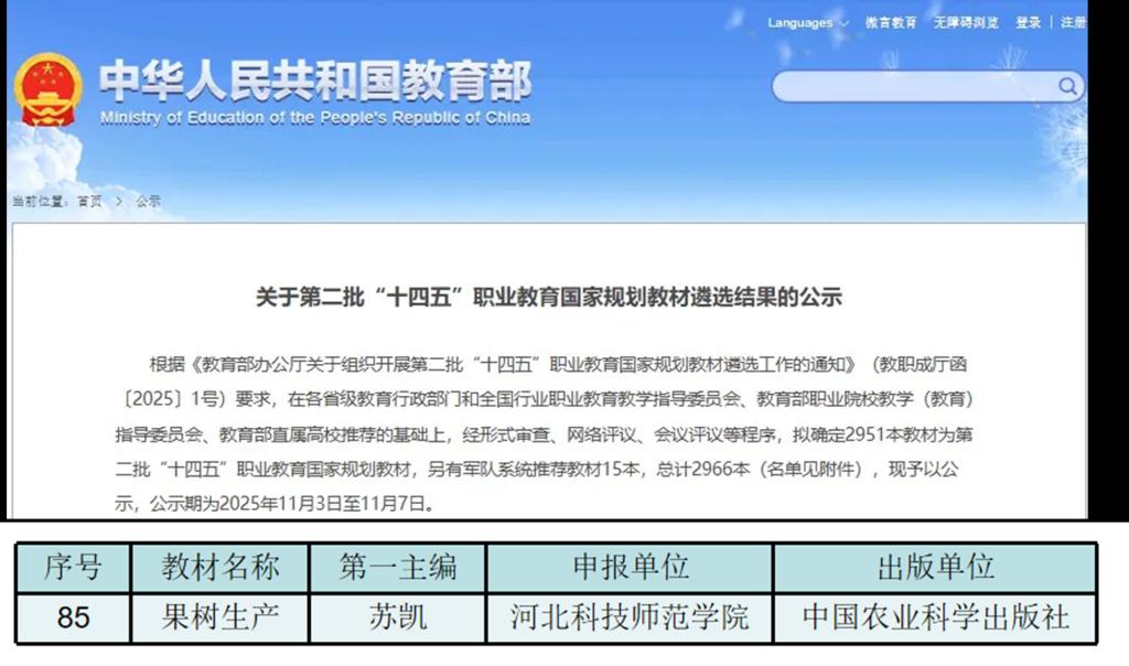 11月3日,教育部办公厅正式公示了第二批“十四五”职业教育国家规划教材遴选结果,公司苏凯副教授主编的中等职业教育教材《果树生产》成功入选,这是公司在教材建设与教学改革领域取得的又一重要成果。