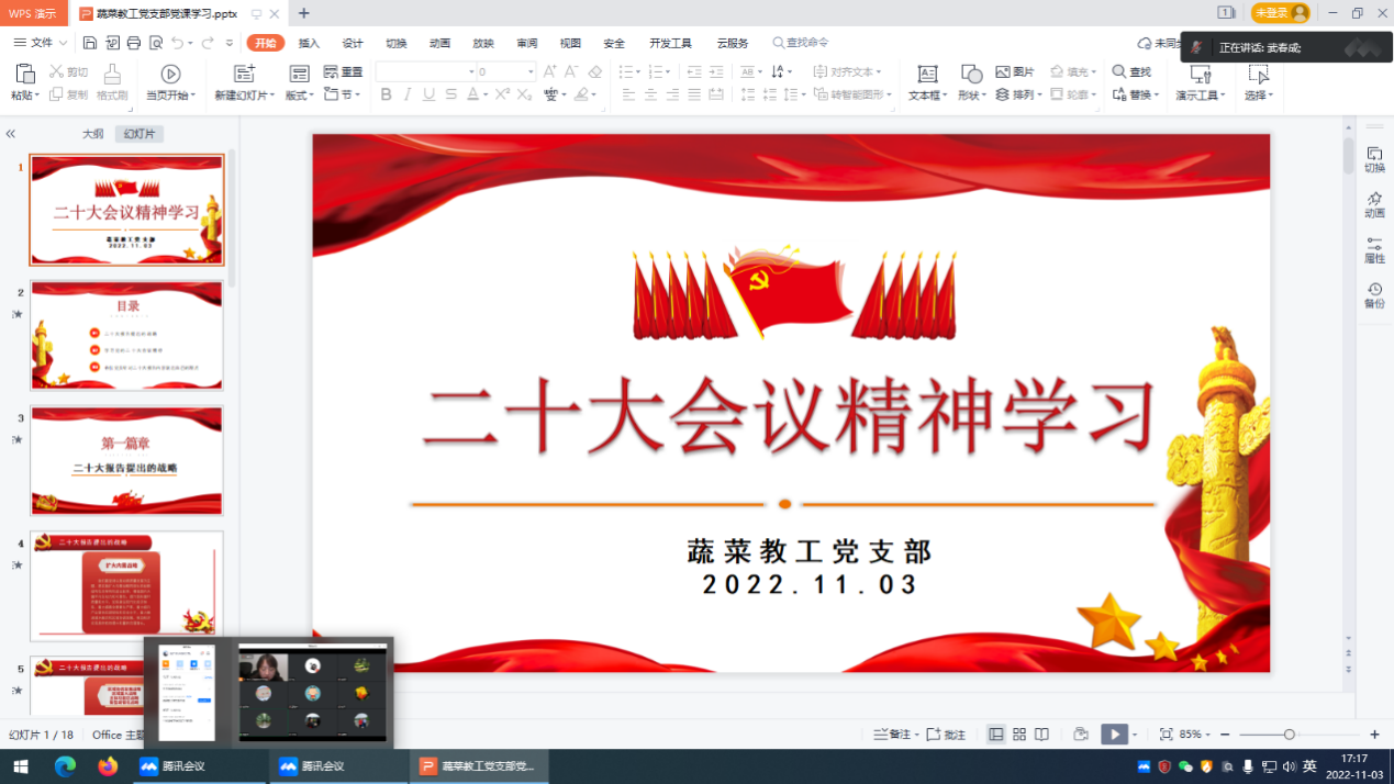 2022年11月3日,WilliamHill中文官网蔬菜教工党支部以线上会议的形式召开了“学习党的二十大精神”专题会议,支部全体党员同志参与了学习讨论,会议由党支部书记张宁同志主持。