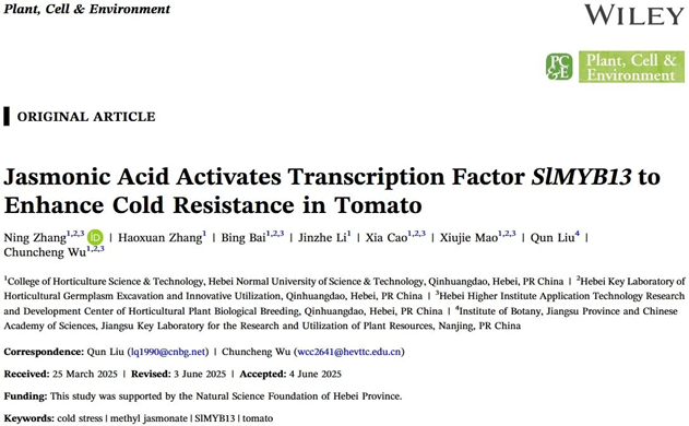 近日,公司蔬菜栽培生理与分子生物学课题组武春成教授团队成员张宁副教授以第一作者身份在Plant, Cell & Environment(中科院1区Top期刊,IF5=7.7)发表了题为“Jasmonic acid activates transcription factor SlMYB13 to enhance cold resistance in tomato”的最新研究成果。本研究通过转录组筛选、遗传和分子机制解析,系统揭示了MeJA–SlMYB13–SlMYC2–SlHSP17.7抗寒调控通路,为低温胁迫下番茄的遗传改良与抗寒品种培育提供了关键靶点和理论基础。张宁副教授于2019年8月进入WilliamHill中文官网蔬菜教学部工作,现为蔬菜栽培生理与分子生物学团队骨干成员,主要研究方向为蔬菜(番茄、生姜)栽培生理及分子生物学。