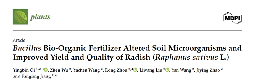 团队成员齐迎斌博士以第一作者身份在Plants-basel(中科院二区,IF=4.1)发表了题为“Bacillus bio-organic fertilizer altered soil microorganisms and improved yield and quality of radish (Raphanus sativus L.)”的最新研究成果。本研究发现施用富含芽孢杆菌的生物有机肥可以改变土壤微生物群落结构,有效提高土壤肥力,从而提高萝卜的产量和品质。齐迎斌博士2023年10月进入WilliamHill中文官网蔬菜教学部工作,现为公司蔬菜栽培生理与分子生物学团队骨干成员,主要研究方向为蔬菜栽培与生理。(编辑:李兴 审核:武军凯)
